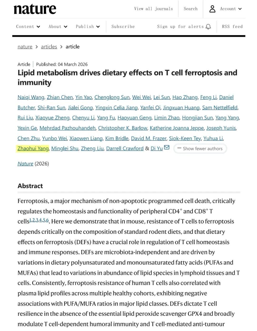 3月5日,国际顶级学术期刊《自然》(Nature)正刊在线发表重磅研究成果《Lipid metabolism drives dietary effects on T cell ferroptos...