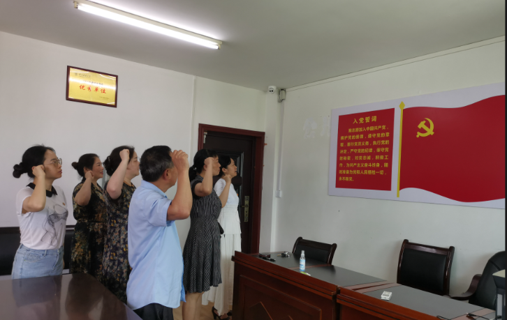 “我志愿加入中国共产党,拥护党的纲领,遵守党的章程……”,宣誓仪式上,面对鲜红的中国共产党党旗,在支部书记刘海峰的领誓下,全体党员右手握拳,举拳过肩,郑重重温入党誓词。铮铮誓言,表达了新时代共产党员的责任与担当,许下了对党忠诚、永不叛党的坚定承诺。
