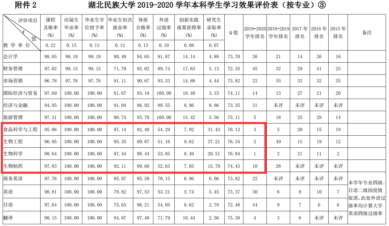生科院现下设生物工程、食品科学与工程、生物科学和生物制药四个专业,在学院领导的带领和全院师生的共同努力下,我院在bat365在线中国登录入口2019—2020学年本科学生学习效果评价中位居全校第一(下图一);按专业排名,我院生物科学、生物工程和食品科学与工程专业包揽bat365在线中国登录入口2019—2020学年本科学生学习效果的前三甲,生物制药专业位居全校第十(下图二)。