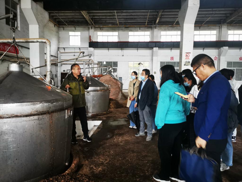 彭璟、周毅峰一行重点走访了湖北晟美康药业有限公司、湖北茅源酒业有限公司。在晟美康,公司负责人带领我院师生实地参观了该公司生产车间、研发中心,重点介绍了公司产品多功能提取工艺和研发现状,让我院学子对所学知识如何应用实际有了更深入的了解,对原料提取理论和工艺的应用有了更深刻地认识。在茅源酒业,我院师生实地感受了酱香型白酒的制作流程和工艺,共同品鉴和探讨,现场氛围热烈。
