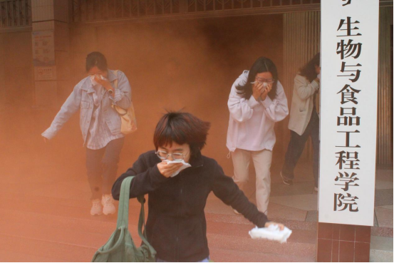 演练现场,防空警报声骤然响起,红色烟雾迅速弥漫,高度还原火灾现场氛围。学院教职工迅速进入应急状态,熟练运用防护技巧,以手紧捂口鼻,严格遵循既定疏散路线,从二楼有条不紊地向一楼平台安全区域快速撤离。整个疏散过程紧张有序,教职工们行动迅速、配合默契,充分展现出良好的应急素养,模拟火灾突发时的真实场景,切实检验学院应急疏散预案的可行性与有效性。