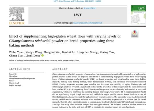 本网讯(通讯员 邓伶俐、原芝荷/文 原芝荷/图)近日,我院食品科学研究团队硕士研究生原芝荷以第一作者身份(通讯作者邓伶俐副教授)在食品领域权威期刊《LWT-Food Science and Technology》发表题为“Effect of supplementing high-gluten wheat flour with varying levels of Chlamydomonas reinhardtii powder on bread properties using three baking methods”的科学论文。该论文系统报道了莱茵衣藻粉(Chlamydomonas reinhardtii powder)在面包制作中的应用,并比较了不同烘焙方法对最终面包品质的影响,为开发营养强化面包提供了理论依据和技术支撑。该研究获国家自然科学基金(32160610)和bat365在线中国登录入口校内高水平科研项目(XN24029)资助。