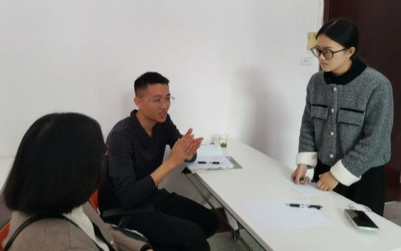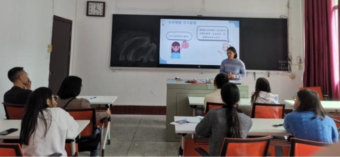 首先参加比赛的两位学生进行模拟授课,然后杨义老师对学生进行全方位评价和指导。杨义老师肯定了同学们在教学目标、教学内容和教学方法等方面的努力,指出了其中存在的不足,并针对这些问题,一一给出建议,帮助学生捋顺教学思路,挖掘参赛亮点。