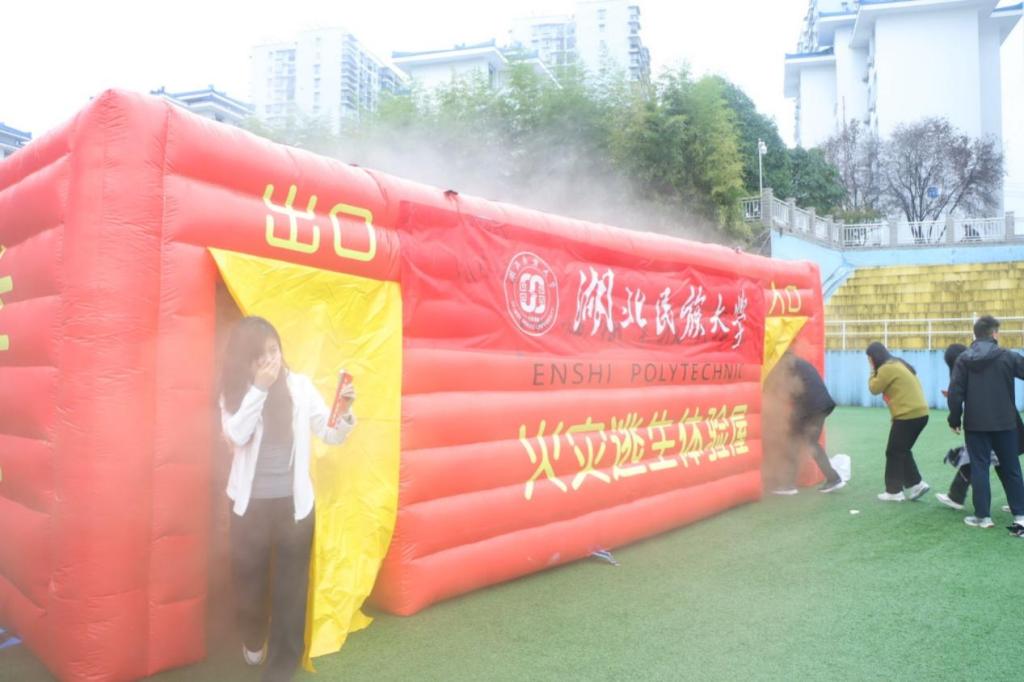 现场设置了逼真的火灾模拟场景和逃生屋演习,师生在工作人员的指导下,用湿毛巾捂住口鼻,弯腰低姿沿着安全通道迅速而有序地疏散,这一环节不仅让参与者亲身体验火灾逃生的过程,还增强了他们的自救能力。