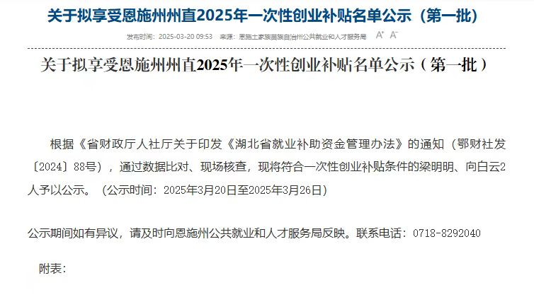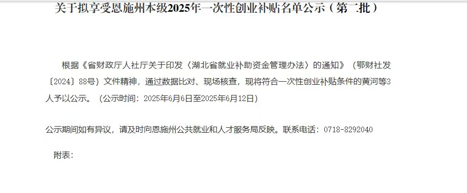恩施州将对符合条件的就业困难人员、高校毕业生以及返乡入乡创业人员发放5000元的一次性创业补贴。