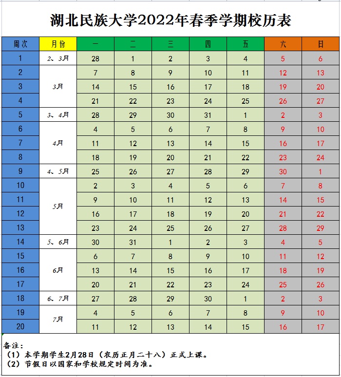 2022年春季学期校历表