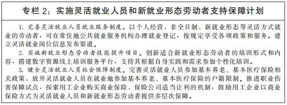 三、坚持经济发展就业导向,不断扩大就业容量 落实就业优先战略,强化就业优先政策,推动形成高质量发展与就业扩容提质互促共进的良性循环。 (四)全面增强就业吸纳能力。 强化就业优先导向的宏观调控。将就业优先政策置于宏观政策层面并持续强化,完善调控手段,充实政策工具箱,强化财政、货币、投资、消费、产业、区域等政策支持就业的导向,实现与就业政策协同联动。深入实施扩大内需战略,持续促进消费、增加有效投资拉动就业,通过保市场主体保就业。健全就业影响评估机制,制定实施宏观政策时要充分考虑对就业的影响,提升重大政策规划、重大工程项目、重大生产力布局对就业的促进作用。健全就业目标责任考核机制,建立更加充分更高质量就业考核评价体系,探索开展高质量就业地区试点工作。 促进制造业高质量就业。实施制造业降本减负行动,引导金融机构扩大制造业中长期融资,提升制造业盈利能力,提高从业人员收入水平,增强制造业就业吸引力,缓解制造业“招工难”问题。推进制造业高质量发展和职业技能培训深度融合,促进制造业产业链、创新链与培训链有效衔接。支持吸纳就业能力强的劳动密集型行业发展。注重发展技能密集型产业,推动传统制造业转型升级赋能、延伸产业链条,开发更多制造业领域技能型就业岗位。立足我国产业规模优势、配套优势和部分领域先发优势,发展服务型制造新模式,做大做强新兴产业链,推动先进制造业集群发展,打造更多制造业就业增长点。 扩大服务业就业。聚焦产业转型升级和消费升级需要,构建优质高效、结构优化、竞争力强的服务产业新体系,为劳动者就业提供更大空间和更多选择。进一步放宽服务业市场准入,深入推进服务业扩大开放,促进服务业数字化转型、线上线下双向发展,推动现代服务业同先进制造业、现代农业深度融合,支持生产性服务业和服务外包创新发展,加快生活服务业高品质和多样化升级,鼓励商贸流通和消费服务业态与模式创新,引导夜间经济、便民生活圈等健康发展,稳定开发社区超市、便利店、社区服务和社会工作服务岗位,充分释放服务业就业容量大的优势。 拓展农业就业空间。深化农业供给侧结构性改革,加强现代农业产业园和农业现代化示范区建设,打造农业全产业链,提升农业价值链,吸纳带动更多就业。实施农民合作社规范提升行动、家庭农场培育计划和高素质农民培育计划,推动小农户与现代农业发展有机衔接,扶持一批农业产业化龙头企业牵头、家庭农场和农民合作社跟进、广大小农户参与的农业产业化联合体,实现抱团发展,促进农民就业增收。 支持中小微企业和个体工商户持续稳定发展增加就业。完善促进中小微企业和个体工商户发展和用工的制度环境和政策体系,构建常态化援企稳岗帮扶机制,持续减轻中小微企业和个体工商户负担,激发中小微企业和个体工商户活力,增强就业岗位创造能力。优化中小微企业发展生态,取消各类不合理限制和壁垒。支持劳动者创办投资小、见效快、易转型、风险小的小规模经济实体。加大对中小微企业和个体工商户融资支持力度,加强普惠金融服务。 (五)培育接续有力的就业新动能。 促进数字经济领域就业创业。加快发展数字经济,推动数字经济和实体经济深度融合,催生更多新产业新业态新商业模式,培育多元化多层次就业需求。健全数字规则,强化数据有序共享和信息安全保护,加快推动数字产业化,打造具有国际竞争力、就业容量大的数字产业集群。深入实施“上云用数赋智”行动,推进传统线下业态数字化转型赋能,创造更多数字经济领域就业机会。促进平台经济等新产业新业态新商业模式规范健康发展,带动更多劳动者依托平台就业创业。 支持多渠道灵活就业和新就业形态发展。破除各种不合理限制,建立促进多渠道灵活就业机制,支持和规范发展新就业形态。鼓励传统行业跨界融合、业态创新,增加灵活就业和新就业形态就业机会。加快落实《关于维护新就业形态劳动者劳动保障权益的指导意见》,建立完善适应灵活就业和新就业形态的劳动权益保障制度,引导支持灵活就业人员和新就业形态劳动者参加社会保险,提高灵活就业人员和新就业形态劳动者社会保障水平。规范平台企业用工,明确平台企业劳动保护责任。健全职业分类动态调整机制,持续开发新职业,发布新职业标准。