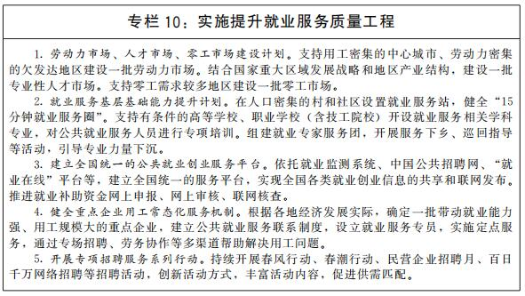 国发〔2021〕14号 各省、自治区、直辖市人民政府,国务院各部委、各直属机构: 现将《“十四五”就业促进规划》印发给你们,请认真贯彻执行。 国务院 2021年8月23日 (此件公开发布) “十四五”就业促进规划 就业是最大的民生,也是经济发展最基本的支撑。“十四五”时期,实现更加充分更高质量就业,是推动高质量发展、全面建设社会主义现代化国家的内在要求,是践行以人民为中心发展思想、扎实推进共同富裕的重要基础。本规划依据《中华人民共和国国民经济和社会发展第十四个五年规划和2035年远景目标纲要》编制,提出了“十四五”时期促进就业的指导思想、基本原则、主要目标、重点任务和保障措施,是推动就业高质量发展的工作指引。 一、发展环境 “十三五”期间,面对错综复杂的国际形势、艰巨繁重的国内改革发展稳定任务特别是新冠肺炎疫情的严重冲击,党中央、国务院始终坚持以人民为中心,将就业摆在经济社会发展优先位置,创新实施就业优先政策,推动就业工作取得积极进展。全国城镇新增就业6564万人,城镇调查失业率均值控制在5.2%,劳动年龄人口平均受教育年限从10.2年提高到10.8年,技能劳动者总量由1.3亿人增至2亿人,就业形势总体稳定,就业结构持续优化,就业质量不断提升。 “十四五”时期是我国全面建成小康社会、实现第一个百年奋斗目标之后,乘势而上开启全面建设社会主义现代化国家新征程、向第二个百年奋斗目标进军的第一个五年。当前和今后一段时期,我国发展仍然处于重要战略机遇期,党中央、国务院高度重视就业问题,实施就业优先战略,为实现更加充分更高质量就业提供了根本保证;我国已转向高质量发展阶段,以国内大循环为主体、国内国际双循环相互促进的新发展格局加快构建,经济稳中向好、长期向好,为就业长期稳定创造了良好条件;新一轮科技革命和产业变革深入发展,新兴就业创业机会日益增多;新型城镇化、乡村振兴孕育巨大发展潜力,新的就业增长点不断涌现;劳动力市场协同性增强,劳动力整体受教育程度上升,社会性流动更加顺畅,为促进就业夯实了人力资源支撑。 但也要看到,“十四五”时期就业领域也出现了许多新变化新趋势。人口结构与经济结构深度调整,劳动力供求两侧均出现较大变化,产业转型升级、技术进步对劳动者技能素质提出了更高要求,人才培养培训不适应市场需求的现象进一步加剧,“就业难”与“招工难”并存,结构性就业矛盾更加突出,将成为就业领域主要矛盾。城镇就业压力依然较大,促进高校毕业生等重点群体就业任务艰巨,在工业化、城镇化进程中,还有大量农村富余劳动力需要转移就业,规模性失业风险不容忽视。同时,就业歧视仍然存在,灵活就业人员和新就业形态劳动者权益保障亟待加强;人工智能等智能化技术加速应用,就业替代效应持续显现;国际环境日趋复杂,不稳定性不确定性明显增加,对就业的潜在冲击需警惕防范。总之,就业形势仍较严峻。必须深刻认识就业领域主要矛盾的变化,深入分析面临的挑战和风险,坚持问题导向,采取务实举措,抓住机遇,调动各种积极因素,不断开创就业工作新局面,努力实现更加充分更高质量就业。 二、总体要求 (一)指导思想。 以习近平新时代中国特色社会主义思想为指导,深入贯彻党的十九大和十九届二中、三中、四中、五中全会精神,统筹推进“五位一体”总体布局,协调推进“四个全面”战略布局,坚持稳中求进工作总基调,立足新发展阶段,完整、准确、全面贯彻新发展理念,构建新发展格局,统筹发展和安全,以实现更加充分更高质量就业为主要目标,深入实施就业优先战略,健全有利于更加充分更高质量就业的促进机制,完善政策体系、强化培训服务、注重权益保障,千方百计扩大就业容量,努力提升就业质量,着力缓解结构性就业矛盾,切实防范和有效化解规模性失业风险,不断增进民生福祉,推动全体人民共同富裕迈出坚实步伐。 (二)基本原则。 ——坚持就业导向、政策协同。继续把就业摆在经济社会发展和宏观政策优先位置,作为保障和改善民生头等大事,把稳定和扩大就业作为宏观调控的优先目标和经济运行合理区间的下限,根据就业形势变化,及时调整宏观政策取向、聚力支持就业。 ——坚持扩容提质、优化结构。兼顾容量、质量与结构,抓住主要矛盾,在多措并举创造更多高质量就业岗位的同时,更加重视日益凸显的结构性就业矛盾,聚焦劳动者技能素质提升,突出抓好技术技能人才培养培训,推动形成劳动力市场更高水平的供需动态平衡。 ——坚持市场主导、政府调控。推动有效市场和有为政府更好结合,既要坚持市场化社会化就业方向,加快破除制约就业的体制机制障碍,充分发挥市场配置劳动力资源的决定性作用,又要强化政府责任,优化整合各类资源,为促进就业提供强有力政策支持和基础性服务保障。 ——坚持聚焦重点、守住底线。紧盯就业领域关键环节和突出问题,瞄准重点地区、重点行业和重点群体,制定更加精准有效的举措,因地因企因人强化分类帮扶援助,切实兜牢民生底线。 (三)主要目标。 到2025年,要实现以下目标: ——就业形势总体平稳。城镇新增就业5500万人以上,努力实现更大规模,城镇调查失业率控制在5.5%以内,重点群体就业保持稳定。城乡、区域就业机会差距逐步缩小,劳动力