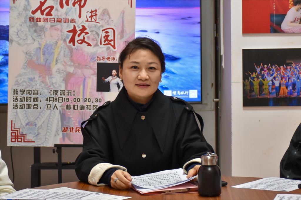 4月8日,bat365官网戏曲团在心语社区举办“名师进校园”指导活动。中国戏剧家协会会员、国家二级演员、湖北省戏剧家协会会员龚敏受邀出席并担任指导教师。龚敏带领学生复习《黄鹤楼》选段,为学生讲解新学曲段《夜深沉》背后蕴含的民族传说,剖析戏剧唱段情感,从咬字清晰、换气自如、节奏控制、情绪抒发等方面指导学生学习选段。龚敏还向学生分享地方戏南剧表演经验与传播地方戏南剧经历,借此让学生了解南剧的发展历史,推广非遗文...