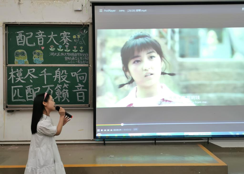 时间:2021-05-07 编辑:学生科 点击:本网讯(通讯员:胡进怡 摄影:詹佳莉、王芷依)为使同学们感受语言魅力,体会语言带来的乐趣,我院特在5月6日晚,于修远楼5b403教室举行以“模尽千般响,匹配万籁音”为主题的配音大赛,出席本次比赛的有外国语学院翻译系主任王军老师、学生科田甜老师、校广播台刘思佳同学、我院主持团欧嫚同学。