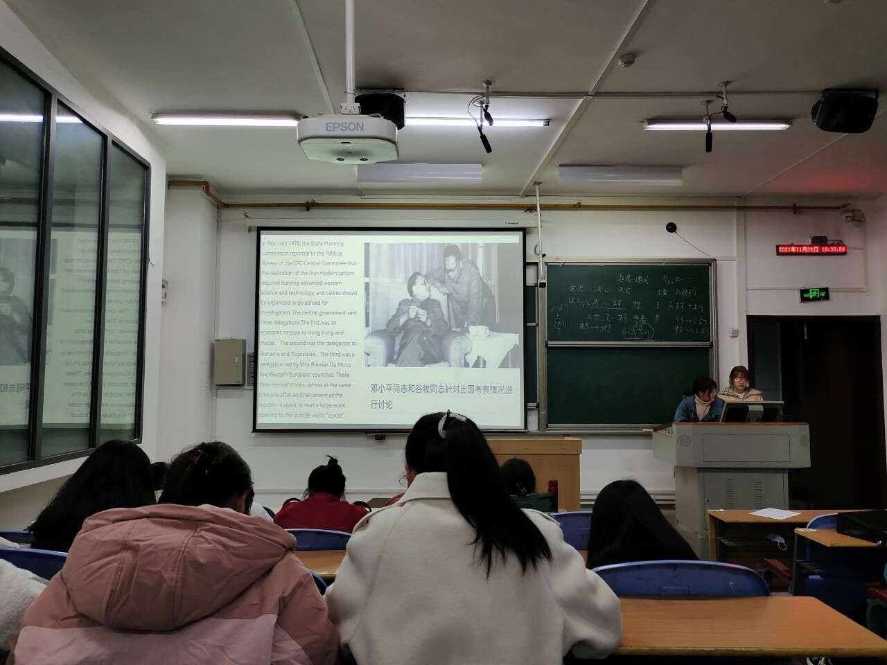 主讲人从十一届三中全会的背景、内容及意义三个方面展开论述。主讲人首先带领学生了解十一届三中全会的背景。十一届三中全会是党中央对“左”倾错误和“两个凡是”方针的否定与批判,随后,带领学生学习其内容和意义。全会实现了思想路线的拔乱反正,重新确立了马克思主义的实事求是的思想路线;并指出党在新时期的历史任务是把我国建设成为社会主义现代化强国,揭开了社会主义改革开放的新篇章。在学习过程中,全体学生全神贯注,聚精会神的学习党的十一届三中全会精神,体现出我院学生良好的学习态度。 学习完党的十一届三中全会的会议精神与内容后,为加强此次学习的效果,全体学生进行十一届三中全会有关知识的题目测试。