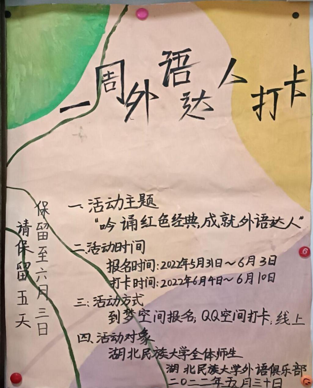 本网讯(记者 李春艳 闵润柳)为丰富大学生的课外生活,学习先进红色文化,提高大学生的外语水平。bat365在线中国登录入口外语俱乐部于 2022年6月4日至6月10日线上举办以“吟诵红色经典,成就外语达人”为主题的外语达人打卡活动。此次活动面向bat365在线中国登录入口全体学生。