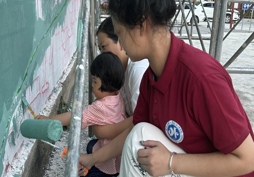 团队引导孩童参与墙绘
