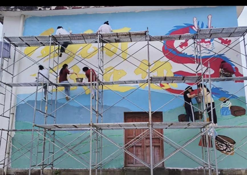 队员们在村委会建筑墙面上开始作画,分工协作、挥洒汗水、色彩交织,历经八天的持续“战斗”,队员们为金龙坪村“献上”了一幅和谐的美丽乡村画卷,一幅生动逼真的墙绘作品逐渐呈现在眼前。作品的上半部分,一条腾云驾雾的金龙盘旋而上,栩栩如生,既彰显了“金龙坪”之名,又寄托了村民们对美好生活的向往。而作品的下半部分则是连绵不绝的茶田风光,嫩绿的茶叶在阳光下泛着光泽,仿佛能闻到那清新的茶叶香,让人心旷神怡。