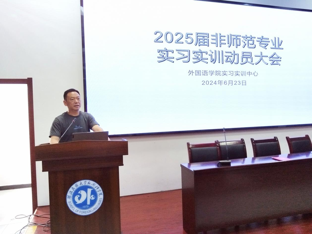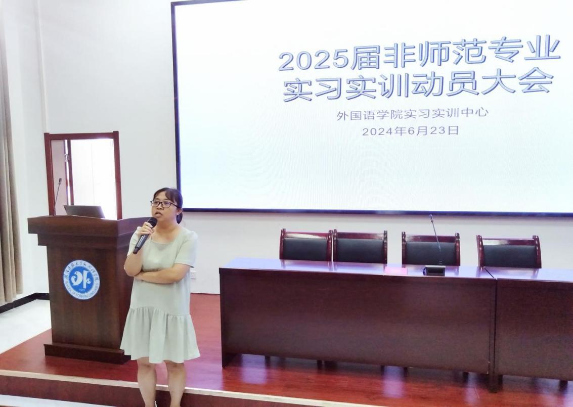 实习新征程,助力未来梦,为了让同学们认识到目前就业形势,树立正确的就业价值观,确保我院2025届毕业生实习就业工作顺利开展,6月23日,我院于6402学术报告厅举行了“2025届非师范专业实习实训动员大会”,外国语学院党总支书记罗成富,实习实训中心主任王军,学生科科长向绍阳,商务英语系主任秦为民和日语系主任郝良燕出席本次活动,汪义军主任担任活动主持人。21级翻译专业、商务英语专业和部分日语专业同学参与了本次活动。