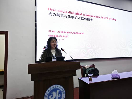 艾斌教授为澳大利亚迪肯大学哲学博士、对外经济贸易大学应用经济学博士后,在应用语言学、社会语言学及跨文化研究领域具有深厚积累。讲座中,他从身份定位、写作难点、跨文化思维与选题方法四个层面系统阐释英语写作的教学理念与实践路径。