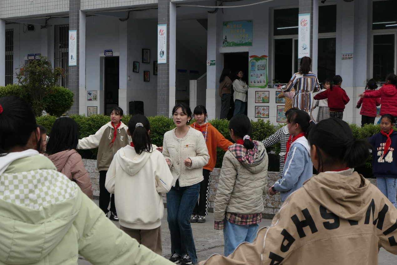 游戏互动环节,小学生们来到户外,在学生党员的带领下开展英语游戏“萝卜蹲”、共跳土家族传统舞蹈——《摆手舞》,在欢快、活跃、气氛高涨的游戏中既学到了新知识,也增进了友谊。
