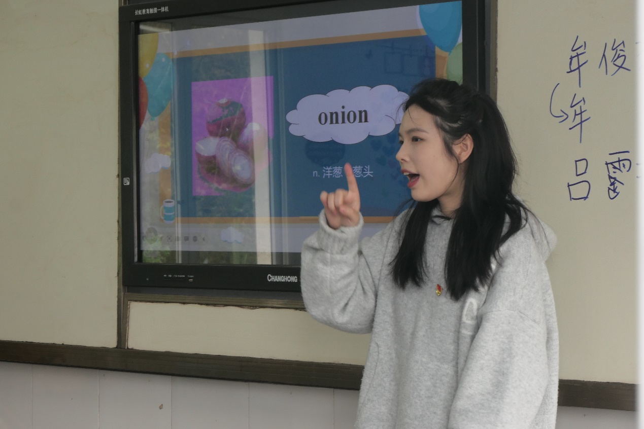“特色讲堂”中,党员们熟练运用多媒体,以实物讲解,穿插卡通图片等方式,教会学生关于动物、蔬菜的一些英文单词,大学生的视野和小学生的奇思妙想进行了一次次思想的碰撞,激发了小朋友的求知欲望。