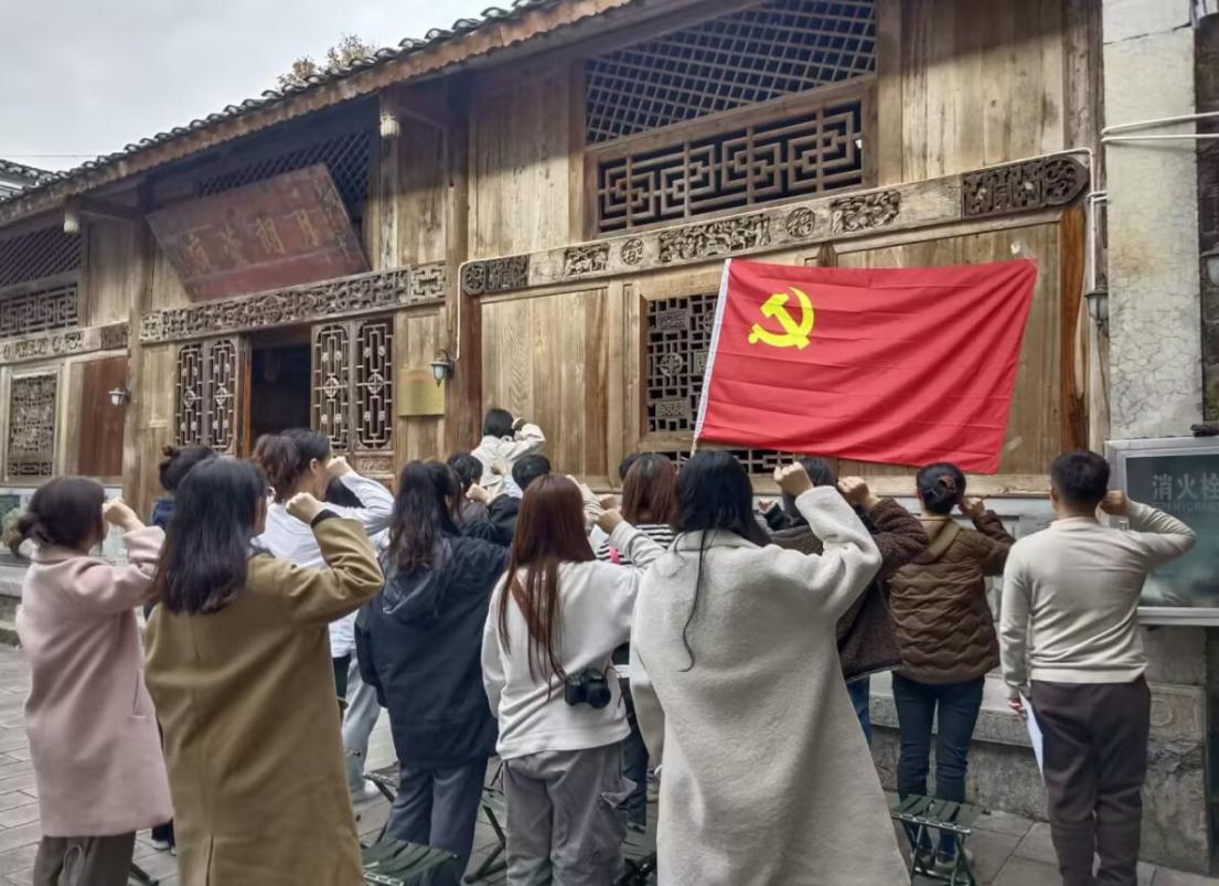 正午明媚的阳光照耀在“月朗宣庭”的尹家牌匾前,党员们在尹家民居前挂上鲜红的党旗,庄严地重温入党誓词。