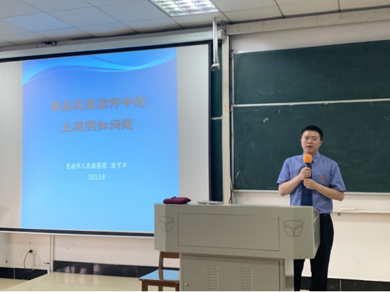 讲座伊始,涂可丰检察官以近年来毒品犯罪案件的增长为引,简单介绍传统毒品类型以及新型毒品的演变和发展,提醒学生要坚决抵制毒品。随后,他从“主观‘明知’的法律依据”、“刑法罪名是否要求‘明知’的判断”等四个方面详细介绍刑事案件中的主观“明知”问题。他指出,毒品案件中主观“明知”的内涵包括主观明知的范围和程度,类型分为告知性明知(知道)和推定性明知(应当知道)。《最高人民法院最高人民检察院公安部办理毒品犯罪案件适用法律若干问题的意见》是常见毒品案件“推定性明知”的法律依据。他指出,“不认识、不知道这是毒品、不清楚毒品的存在和数量、毒品有可能是他人的(如前车主、房主等)、不清楚行为性质(陪同他人、接送等)、不清楚他人行为性质”是毒品案件中常见的主观“不明知”的辩解。最后,他以“瞿某案”和“叶某、谭某贩卖、运输毒品案”为例,强调推定明知的成立需将“正面证明”和“反面驳斥”有机结合,从事实存疑有利于被告人的角度出发,应达到排除合理怀疑的程度。