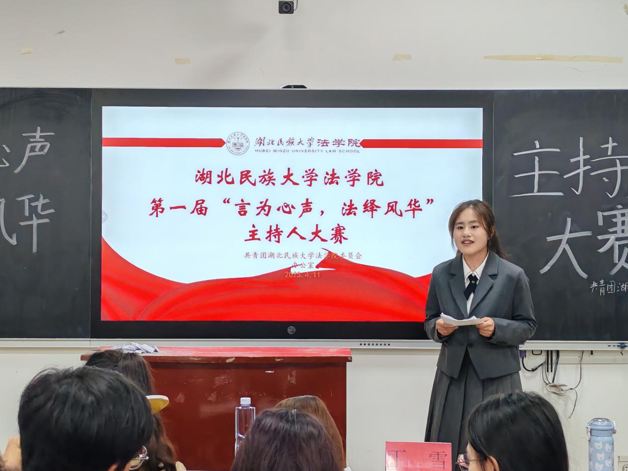 本网讯(记者 袁本怡 见习记者 曾钰格/文 实习记者 李佳萱/图)4月11日,以“言为心声,法绎风华”为主题的主持人大赛于我院9B306教室举行。法学院团委副书记丁雪同学、bat365在线中国登录入口讲解团团长崔钰婕同学、bat365在线中国登录入口广播台负责人田曼琦同学担任评委,我院多名本科生参赛。