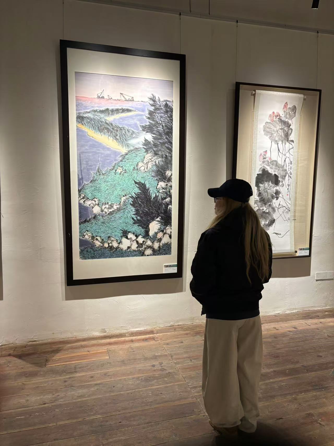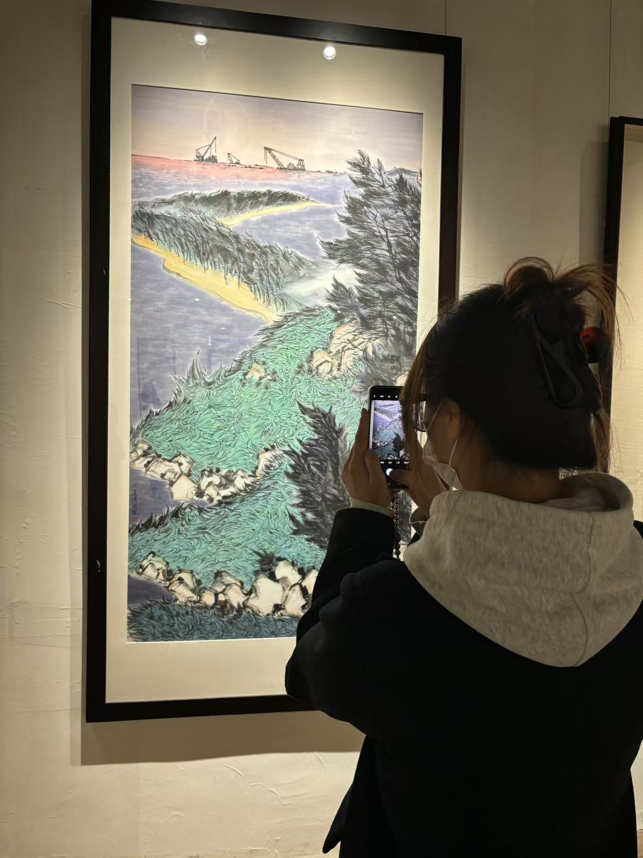 参观当天,岭南画派名家云集,现场气氛热烈。在画展的展厅里,一幅幅画作犹如一个个历史与文化的诉说者,静静地等待着知音的到来。同学们听着画作简介,眼睛里闪烁着好奇与惊叹的光芒,忍不住与心仪画作合影。色彩斑斓、笔触灵动的画卷,所绘的山水风光,似乎在他们耳边吟唱来自岭南的歌声。