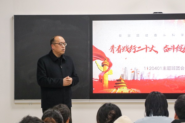 本网讯(见习记者 陈咏琪/文 见习记者 饶文婧/图)2月26日,学校纪委书记张宏磊来我院指导开展“青春践行二十大 奋斗绽放绚丽花”主题班团会,并在9B306教室与1120401班同学亲切交流。学生工作部部长方云霞,思政教师代表鲁帅,我院党总支副书记许宗友、学生科科长阙嘉苗参加了1120401班的主体班团会。