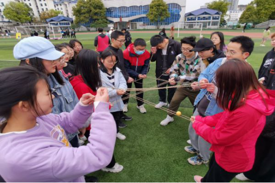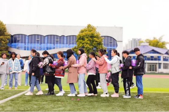 各班级在熟悉规则后依次开展不同的游戏活动。在“男生女生向前冲”赛区,十名学生排成一列依次夹着气球喊着“一二一”的口号向前进,气球落地又立刻回到起点重新开始,在班级学生的共同努力下,队伍顺利到达终点,学生抱成一团,相互鼓励。“纵横天下”、“两人三足”和“跳大绳”赛区也分外热闹,学生们互相加油鼓劲抵达终点。