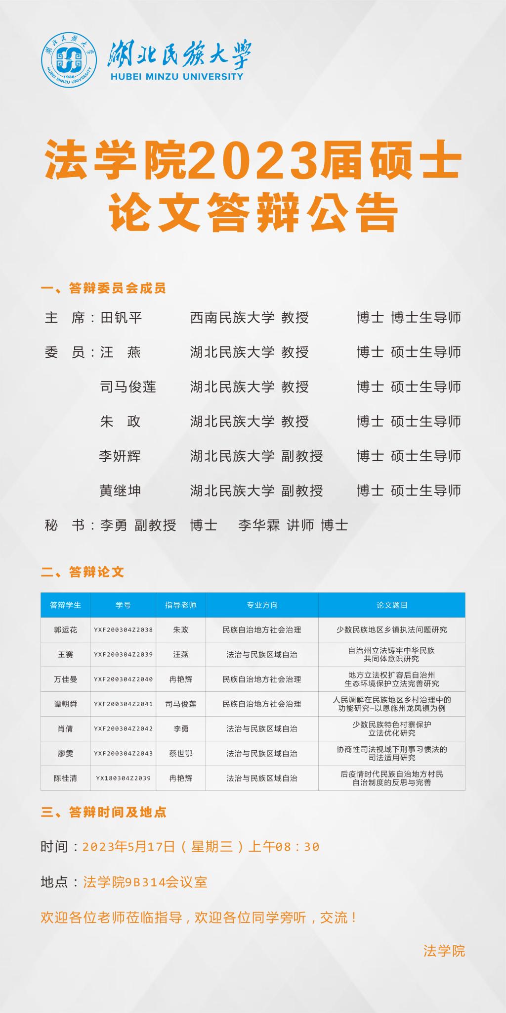 法学院2023届硕士论文答辩公告