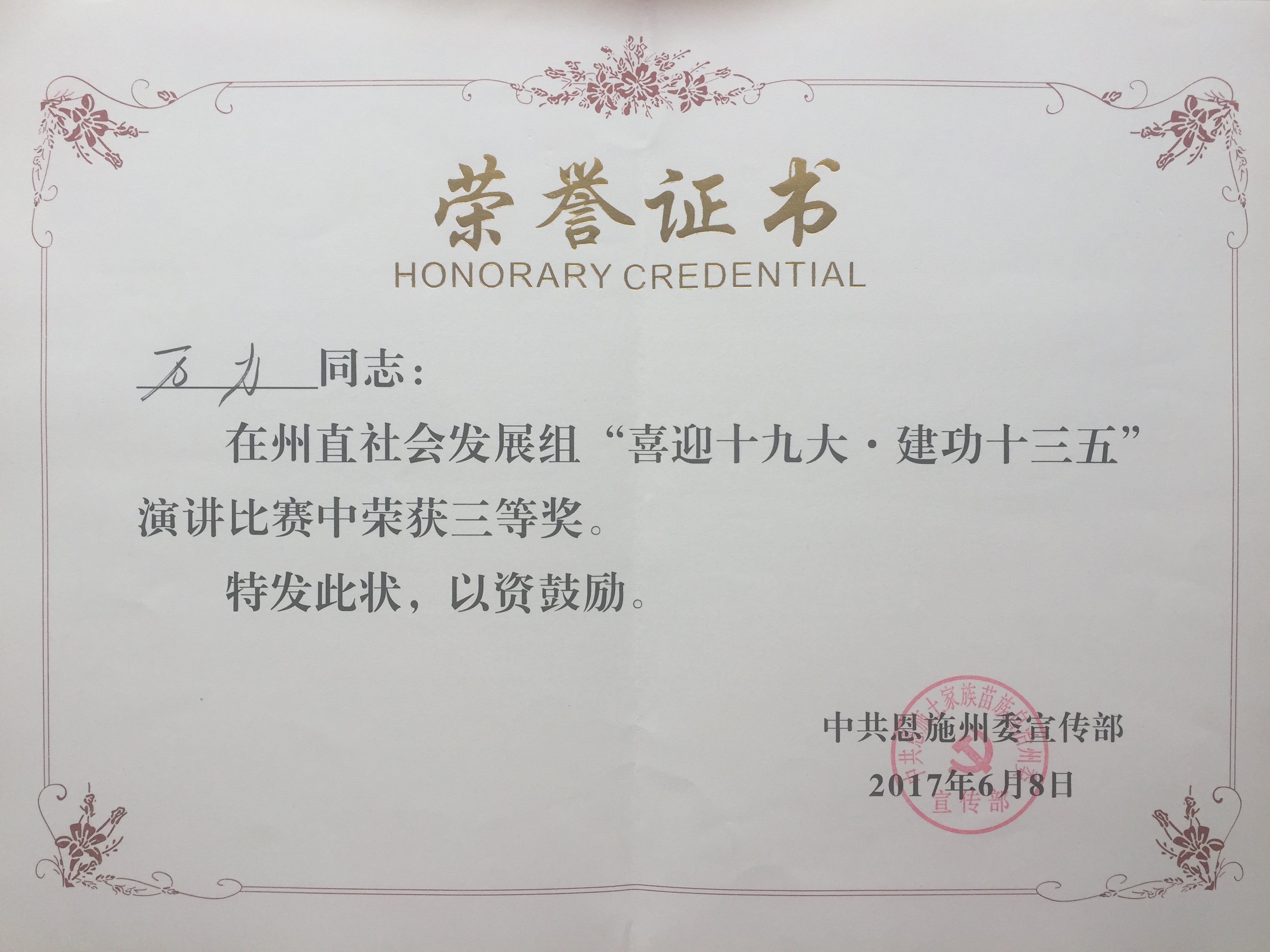 bat365官网万力老师在州委宣传部、州委州直机关工委、州总工会联合举办“喜迎十九大.建功十三五”演讲比赛中荣获社会发展组三等奖。