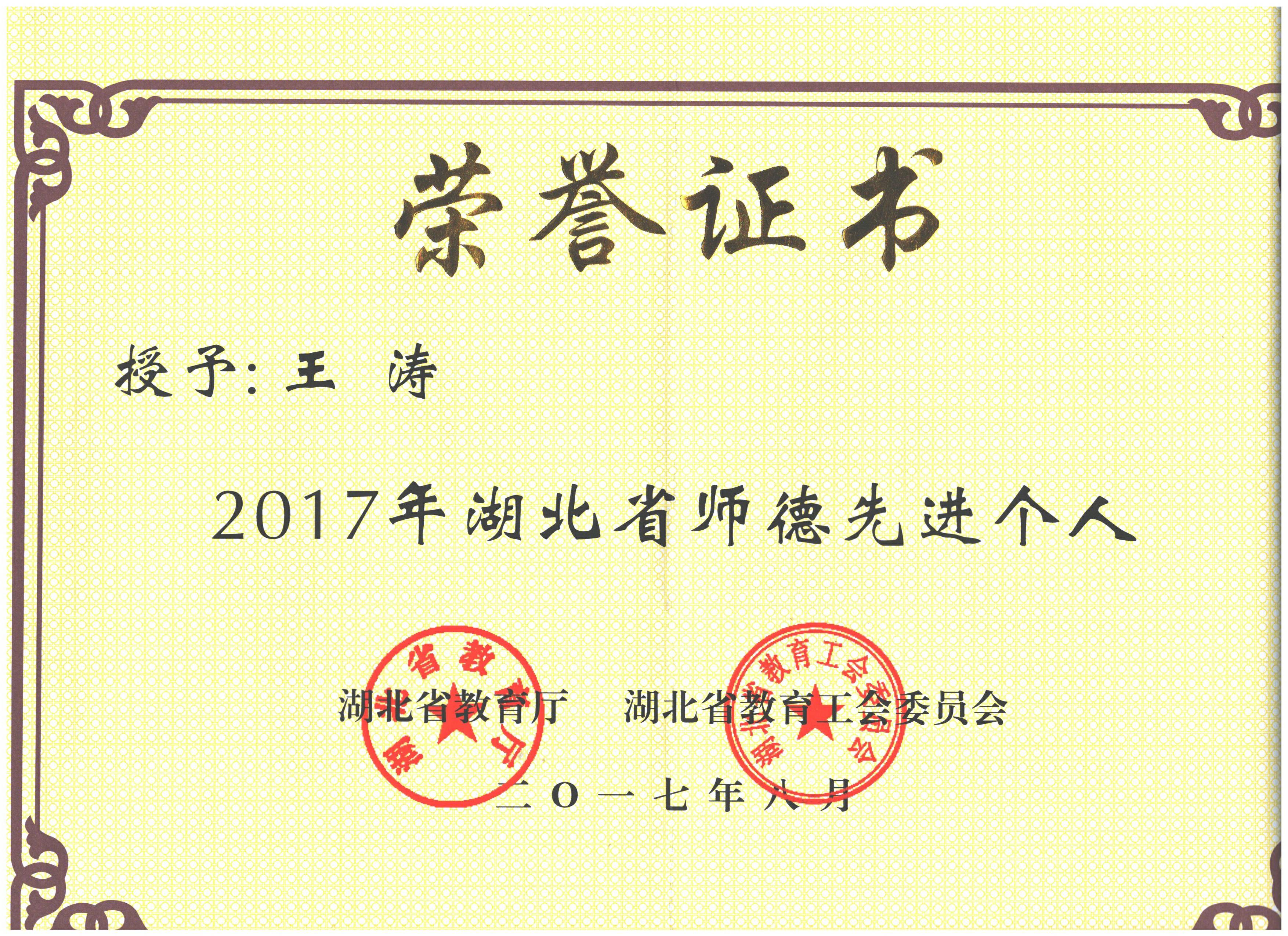 王涛荣获湖北省师德先进个人