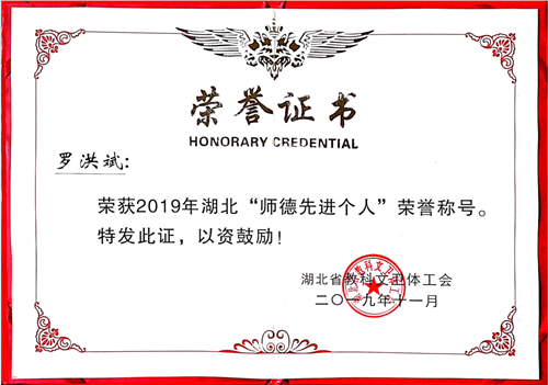 bat365官网教师罗洪斌荣获2019年湖北省“师德先进个人”荣誉称号