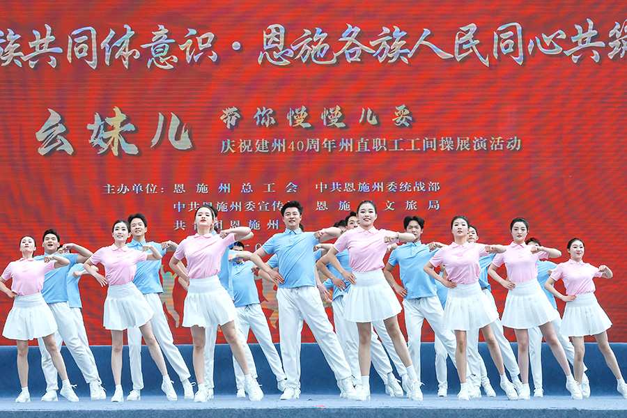 4月11日,铸牢中华民族共同体意识·恩施各族人民同心共筑中国梦——庆祝建州40周年《幺妹儿带你慢慢儿耍》州直职工工间操展演活动在恩施州工人文化宫广场成功举行,由学校工会组织的教职工代表队荣获二等奖。