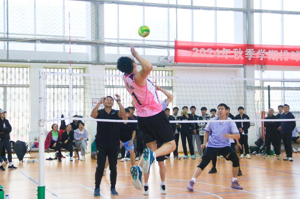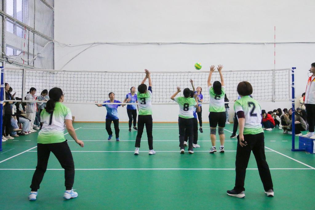 比赛现场,各参赛队伍奋力拼搏,配合默契。各代表队发球有力、接球沉稳、传球精准、扣球精彩。体育学院与化学与环境工程学院双方队员你来我往,比分紧咬。体育学院代表队凭借出色的身体素质和专业的球技,在关键时刻连连得分。女子组的外国语学院和林学园艺学院的比赛也毫不逊色。女老师们巾帼不让须眉,每一个球都全力以赴,精准的传球、扣球和拦网,都展示出他们高超的技巧和团队协作能力。场外观众热情高涨,加油声、喝彩声此起彼伏,现场气氛热烈。
