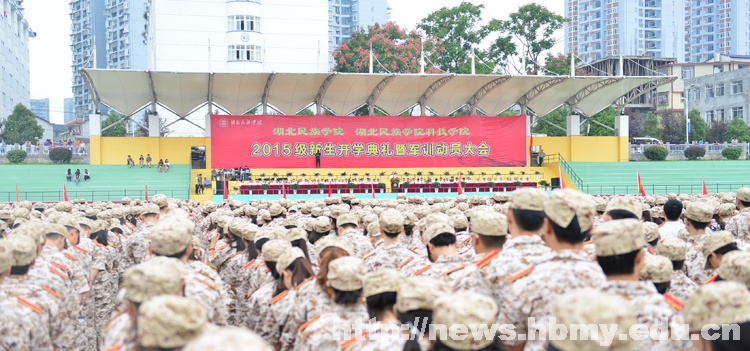 本网讯9月14日上午,湖北民族学院、湖北民族学院科技学院2015级新生开学典礼暨军训动员大会在五环运动场隆重举行。来自全国各地、各民族的7000余名2015级新生及新生家长代表参加了开学典礼。