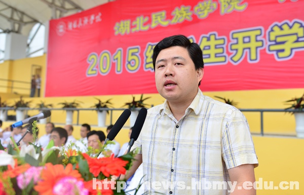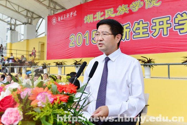 学校领导戴小明、顿祖义、韩思懿、汪兴平、李清政、邓磊、祝建波,恩施军分区参谋长向代祥,科技学院党委书记丁莉、院长刘杰书以及学校各单位负责人在主席台就坐。学校党委副书记顿祖义主持开学典礼。学工处处长唐敦双在开学典礼前介绍主席台领导。