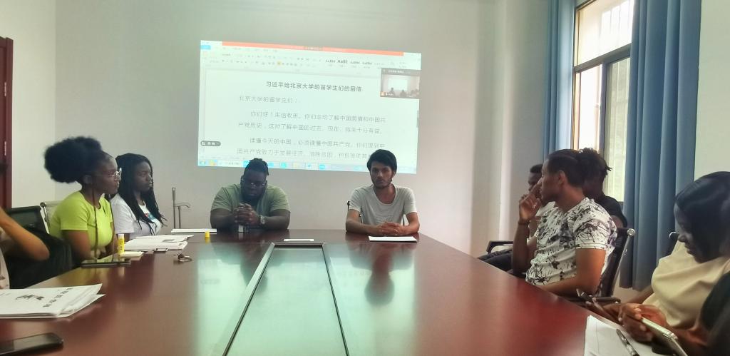 6月29日,国际教育学院组织在校留学生及所有海外留学生,通过线上线下同步会议的方式,仔细学习了《习近平给北京大学的留学生们的回信》、《习近平给北京科技大学全体巴基斯坦留学生的回信》。信中,习近平总书记提到“百闻不如一见”,鼓励国际学生多到中国各地走走看看,多了解中国共产党的历史,多了解中国的过去、现在、将来,并把了解的真实中国介绍给更多的人。读完两封回信,同学们结合自己在中国的学习与生活,谈了谈自己眼中的中国。