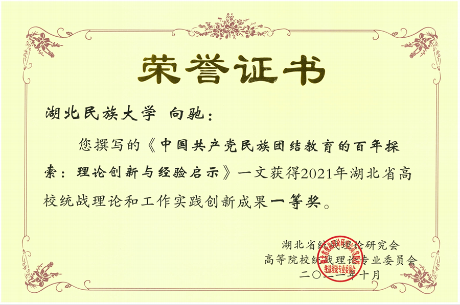 2021年,学校党委深入学习贯彻习近平总书记关于加强和改进统一战线工作的重要思想,党委统战部积极探索做好新时代高校统战工作的新思路新举措,认真组织统一战线理论政策调研,向驰同志撰写的《中国共产党民族团结教育的百年探索:理论创新与经验启示》获统战理论研究一等奖,并被推荐在年会上进行交流。目前,该文章已由湖北省委统战部遴选报送至中央统战部,参加2021年度全国统战理论政策研究创新成果奖评选。