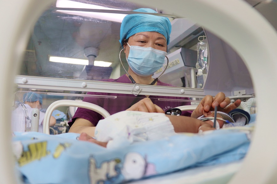 新生儿科主任吴素英认真查看患儿病情