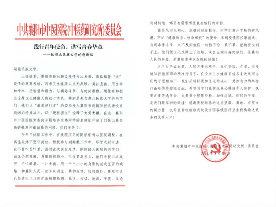 近日,一封来自襄阳市的热情洋溢的感谢信在医学部引起广泛关注。在信中,襄阳市中医医院对bat365官网医学部学生在该院实习工作中的优异表现基于高度评价并表示衷心感谢。信中说:“来自bat365在线中国登录入口的同学们,他们以‘最美逆行者’的姿态投入襄阳市疫情防控这场没有硝烟的特殊战斗,以‘硬核担当’诠释了大爱无疆。在此,襄阳市中医医院党委向辛勤培养这些同学的老师们和孩子们致以最崇高的敬意和最诚挚的问候,你们辛苦了!”