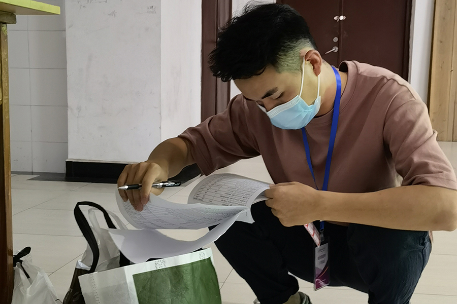 在每日核酸采样的前一天,周家頔老师总会逐一清点采样物资,并将其归类摆放好。翌日,医学部全体辅导员便在06:45之前,早早地在各自负责的采样点集合,在医学部党委常务副书记廖云的指挥下,共同维持队伍秩序、提醒学生保持一米间距、分发医疗物资、指导志愿者、通知班级排队、统计核酸采样数据等日常工作。在老师和志愿者们的默契配合下,医学部两千多人的核酸采样工作往往只需要两个小时就能完成。尽管如此,由于人数众多,医学部部分学生因支援前线被抽调而处于动态变化中,核酸采样的统计工作依旧面临着不小压力,为确保上报的数据真实准确,通过采取班级清点人数、班主任上报已采样人数与系统已扫码人数三者进行比对的方式,从而精确摸排到每一位学生的核酸采样情况,真正达到“应检尽检、不漏一人”的要求。