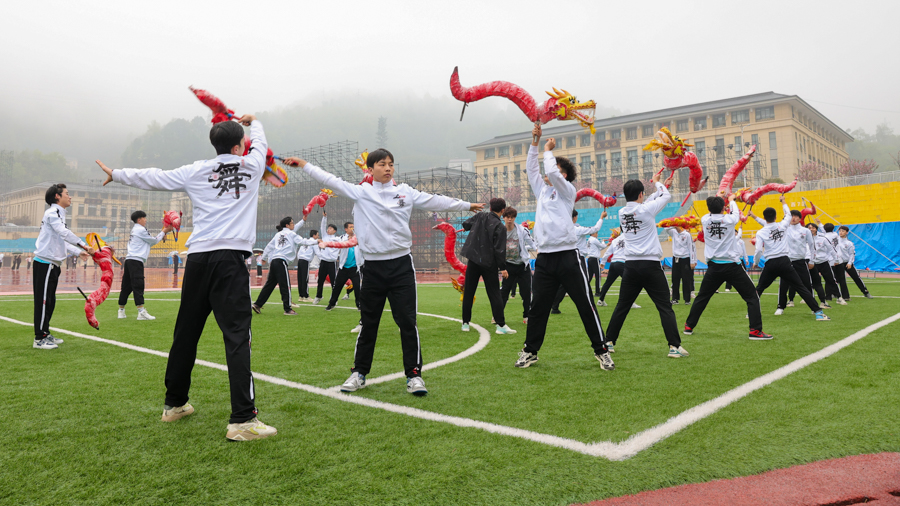 此次民运会不仅有在赛场上奋力拼搏的运动员,还有紧张筹备开幕式的民大学子。湖北省第十届少数民族传统体育运动会开幕式将于4月23日晚在五峰土家族自治县党校职教中心举行。受五峰土家族自治县政府邀请,bat365在线中国登录入口音乐舞蹈学院的200名学子于4月1日到达五峰县开展为期22天的排练,参与开幕式序篇《相聚茶乡》、第二篇章《多彩绘梦》、第三篇章《奔跑逐梦》、第四篇章《金秋圆梦》的表演,并承担各代表队入场引导员的工作。4月20日进行了开幕式第一次全流程仿真彩排,为正式开幕式做准备。