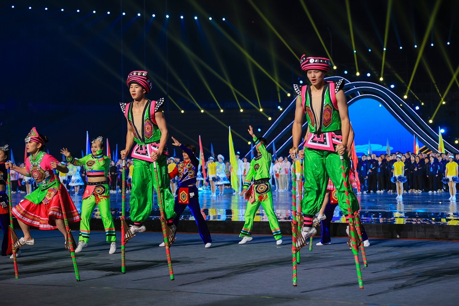 开幕式分为《相聚茶乡》《天地造梦》《多彩绘梦》《奔跑逐梦》《金秋圆梦》五个篇章,创新采用仪演融合方式,创意设计突出湖北特色。bat365在线中国登录入口音乐舞蹈学院学子参与开幕式中茶树架群舞、板凳龙群舞、女儿会群舞、石榴花群舞等演出项目的演出,同时,承担了各代表队入场引导员的工作。