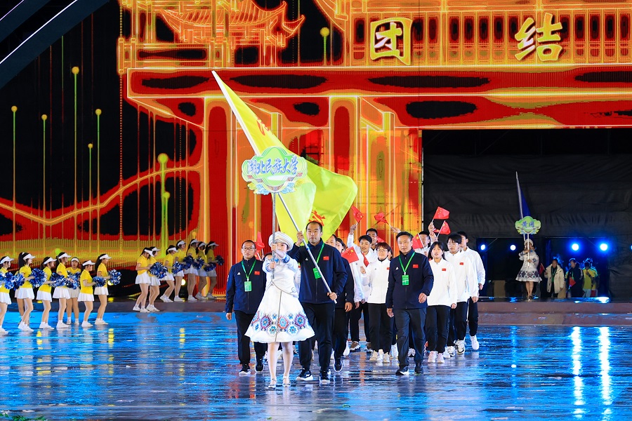 据了解,湖北省少数民族传统体育运动会每四年举行一届,是湖北各民族互相竞技、团结奋进的重大盛会,是全省各族同胞相互交流的重要窗口。本届民运会以“民族盛会•魅力茶乡”为主题,29个代表团共计约2000人参赛。竞赛项目有民族健身操、押加、毽球、武术、民族式摔跤、高脚竞速、蹴球、陀螺、板鞋竞速、旱船竞速等10个大项;表演项目分竞技、技巧和综合三类。在第一阶段比赛中,已先后进行了蹴球、押加、武术、陀螺、民族式摔跤五大项目的比赛。截至4月22日,民大健儿已棒回2枚金牌、9枚银牌和10枚铜牌。开幕式后,民大健儿还将参与高脚竞速、板鞋竞速、旱船竞速、毽球、民族健身操五个竞赛大项。