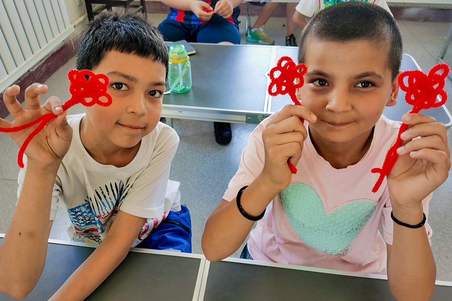 在创意手工课上,实践团成员用扭扭棒制作了中国结、五角星,用黏土捏了实践活动吉祥物“榴榴”、五星红旗、石榴花等,孩子们很容易就学会了,自己还动手制作了很多创意小作品。