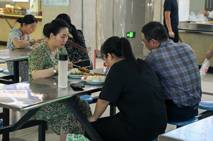 家长与新生在食堂进餐