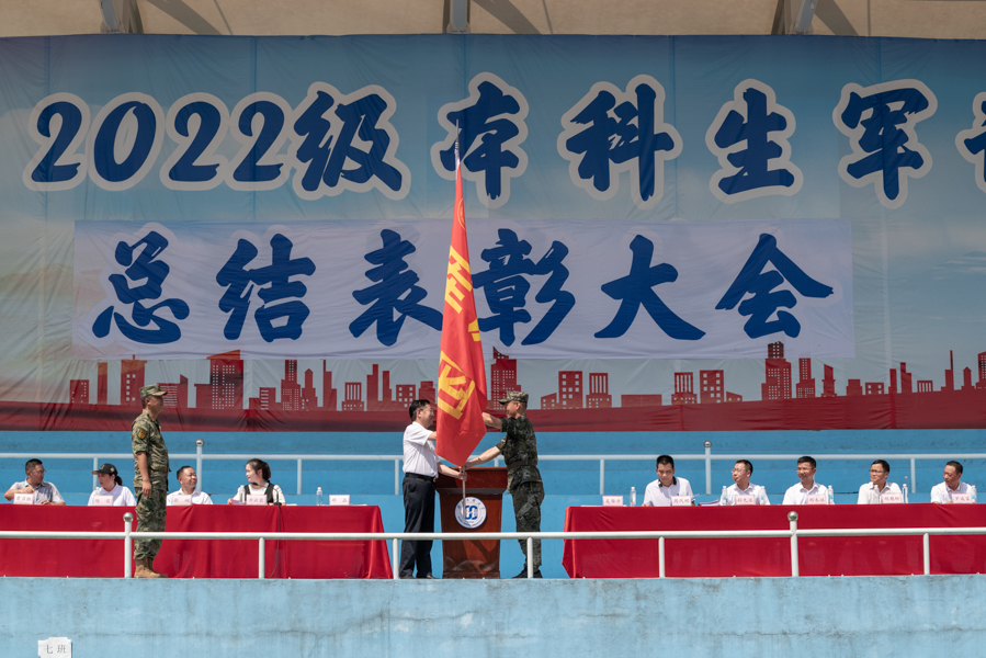 吴华平和邓磊交接军训团团旗。吴华平下达军事命令,宣布bat365在线中国登录入口2022级本科生军训圆满结束。大会在《中国人民解放军军歌》中落下帷幕。