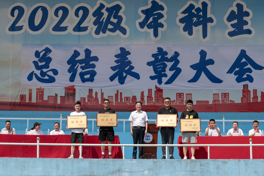 总结表彰大会上,吴华平通报军训成绩。学校党委宣传部副部长万力宣读2022级本科生军训团表彰文件,马克思主义学院、体育学院、法学院、教师教育学院荣获“标兵连”称号,音乐舞蹈学院、经济与管理学院、生物与食品工程学院、外国语学院、医学部、民族学与社会学学院获得“优秀连”称号,美术与设计学院、林学园艺学院、智能科学与工程学院、化学与环境工程学院、数学与统计学院、文学与传媒学院获得“优胜连”称号,徐德强等8位教官授予“优秀教官”称号,马锐等87名学员获得“优秀学员”称号。参会领导分别为受到表彰的学院、教官及学员颁奖。