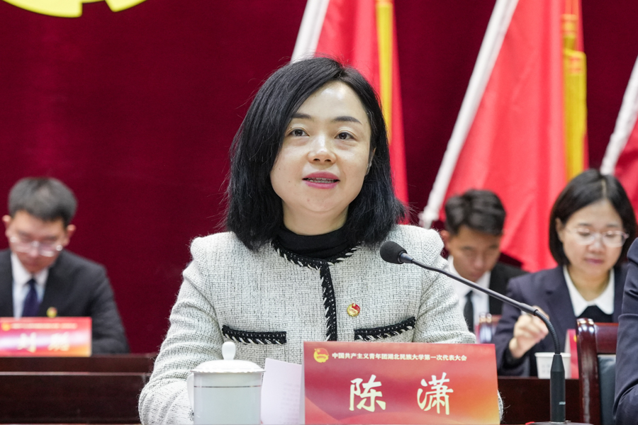 陈潇代表共青团恩施州委向大会召开表示祝贺。她表示,民大共青团在校党委领导下,围绕学校中心工作和立德树人根本任务,在思想引领、实践育人、组织建设和深化改革等方面都做出大量卓有成效的探索。对此,她对未来学校共青团工作提出三点期望,广大团员青年要胸怀“国之大者”,践行“请党放心、强国有我”的青春誓言;广大团干部要矢志追求卓越,练就“本领扎实、心系青年”的担当铁肩;学校各级团组织坚持锐意改革,永葆“实事求是、朝气蓬勃”的清新形象。
