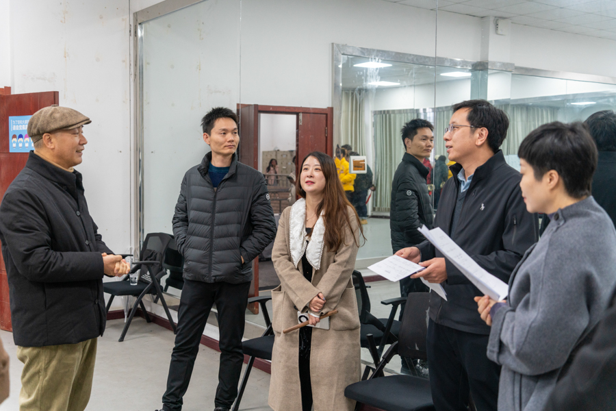 在立人片区的心语社区,张龙一行调研了美育工作坊的建设工作,通过考察音乐舞蹈学院常规活动、参观学生创作的非遗传承项目作品,实地了解学校美育工作落实情况。在音乐舞蹈学院,张龙到戏曲工作坊观摩了柳子戏省级传承人肖宗祥教授打溜子《一二三打溜子》、柳子戏《同结相思扣》选段,与肖宗祥交流柳子戏相关内容。同时,张龙了解了《老兵》主创团队以及音乐舞蹈学院“全省党建工作标杆院系”建设单位相关内容。